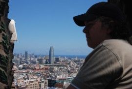 Maximilian blickt von einer der Brücken zwischen den Türmen des Ostportals über Barcelona.