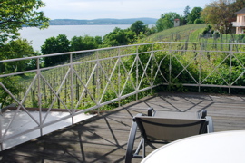 Terrasse der Pension "Landhaus Ödenstein" in Meersburg mit Blick auf den Bodensee und den oberen, nicht so steilen Teil der Lage Meersburger Chorherrenhalde.