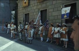 Siena. Kostümierte Abgeordnete der Contrada "Einhorn" vor dem Haus der Bank "Monte dei Paschi di Siena" sehen ihren Fahnenschwenkern zu.