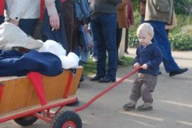 Jakob zieht den Bollerwagen.