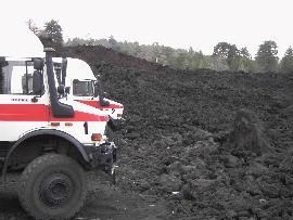 Expeditionsfahrzeuge am Basislager auf knapp 2000 Meter Höhe am Nordhang des Ätna.