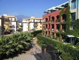 Hotel Caesar Palace in Giardini Naxox mit rauchendem Ätna im Hintergrund